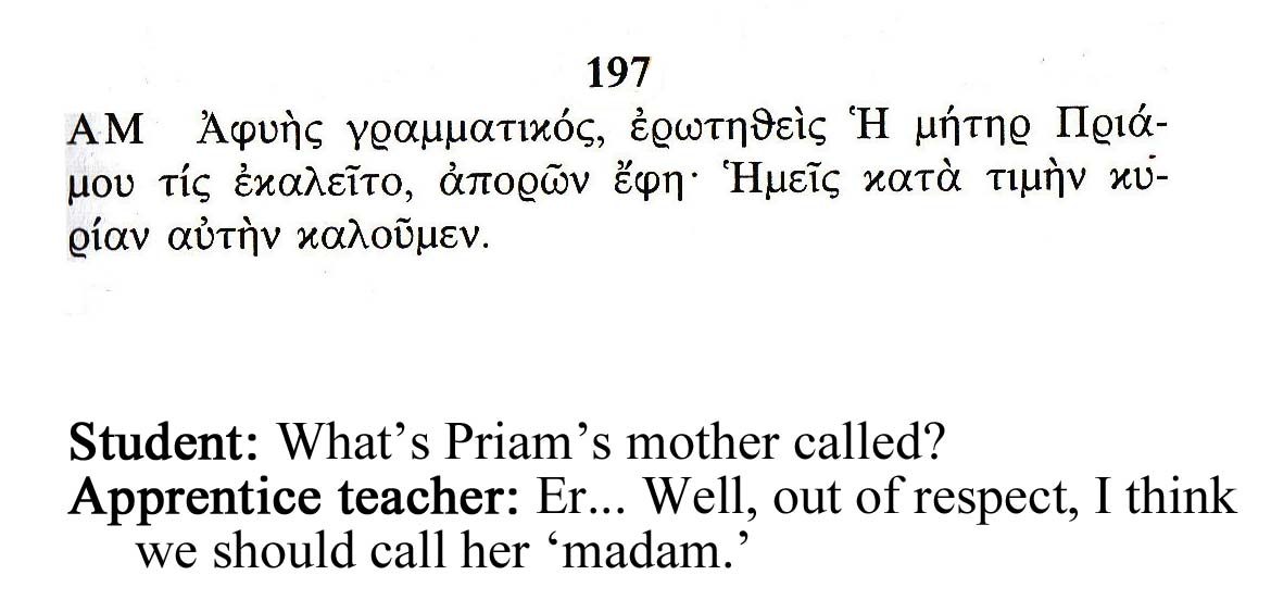 The Greek text accompanying each joke is taken from Philogelos, ed. R.E. Dawe. Bibliotheca Teubneriana. Munich and Leipzig: K.G. Saur, 2000. The English translation is that of Crompton, listed above. Each joke’s number refers to its number in the Greek (Teubner) edition.
