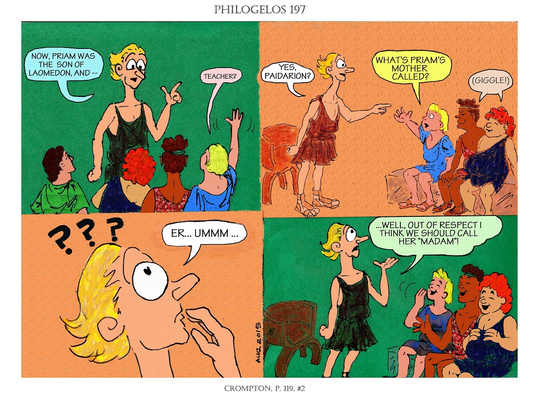 After reading Dan Crompton’s translation of the Philogelos (A Funny Thing Happened on the Way to the Forum: The World’s Oldest Joke Book [2010]), Linda Thompson was struck by the idea that a number of the jokes in the collection could work well as cartoons. We hope you’ll enjoy the 20th installment in this series!