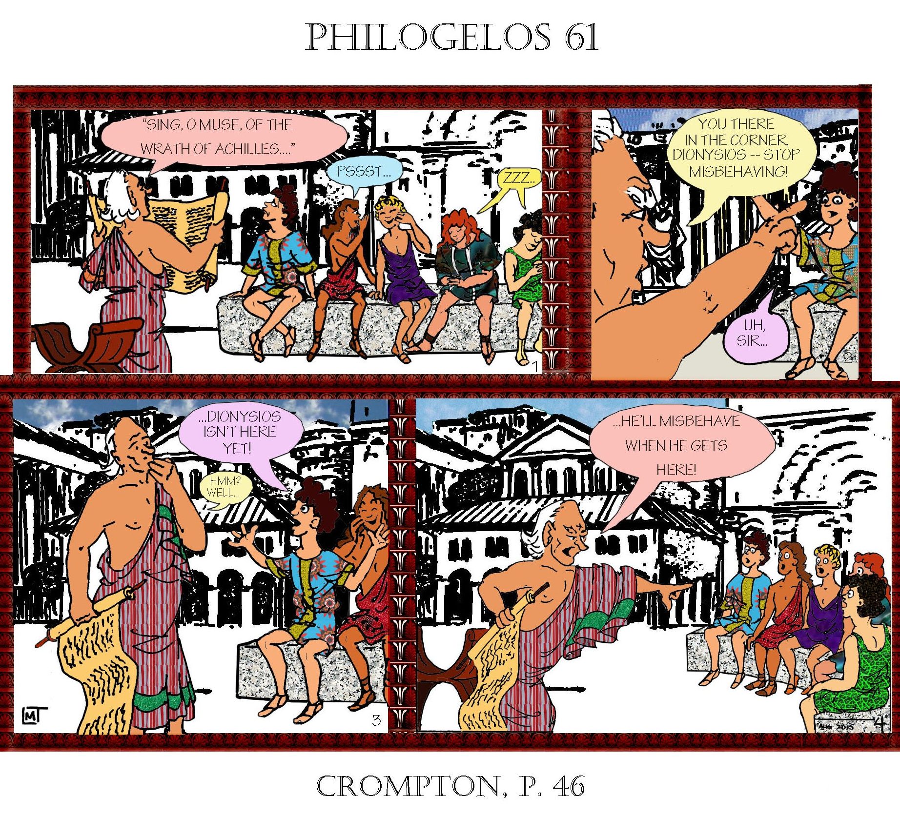 After reading Dan Crompton’s translation of the Philogelos (A Funny Thing Happened on the Way to the Forum: The World’s Oldest Joke Book [2010]), Linda Thompson was struck by the idea that a number of the jokes in the collection could work well as cartoons. We hope you’ll enjoy this installment in the series!